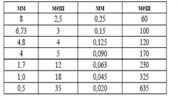 1 меш – число отворів сита на одному лінійному дюймі, тобто на відстані 25,4 мм. Співвідношення меш з виміром, що застосовується в Україні (лінійним розміром сторони або діаметра отвору) - див. таблицю.