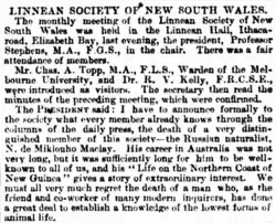 - «Linnean Society of New South Wales» // «The Sydney Morning Herald», Thursday 26 April 1888, p. 11 (англ.)