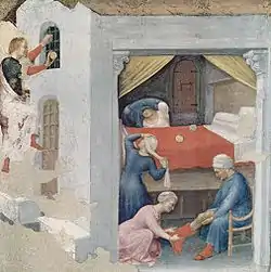 Один збіднілий чоловік не міг забезпечити своїх трьох доньок приданим. І, оскільки, відповідно до тамтешніх звичаїв, вони не зможуть вийти заміж, батько збирався відправити їх займатись проституцією. Дізнавшись про це, Микола, на той час ще не єпископ, вирішує скористатись батьківським спадком, щоб зарадити біді. Протягом трьох ночей він пробирався до убогої хатини та щоразу закидав крізь вікно, у кімнату де ночували сестри, шмат золота — на придане для кожної з дочок.