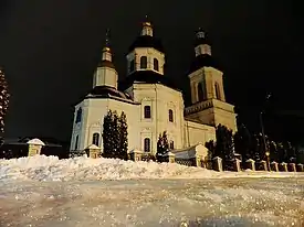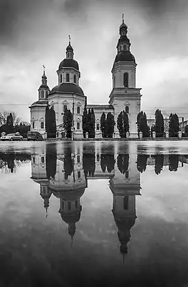 Мурована, тридільна, двоверха церква з дзвіницею стоїть в історичному середмісті посеред центрального майдану — Соборного, посідаючи острівне становище в його структурі.[5]