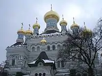 Ескіз проекту, на прохання великої княгині, підготував її син Петро Миколайович. За його малюнком архітектор Володимир Ніколаєв розробив проєктні креслення. Храму було надано пирамідальної форми, його вінчали загалом 15 цибулястих бань різної величини (головна центральна баня, по 4 наріжних у два яруси, окремі бані над вівтарем, над вівтарною апсидою, над західним фасадом, а також малі бані над шатровими завершеннями трьох порталів з північного. західного й південного боку). Оформлення набуло рис «російського стилю»; разом з тим, укрупнення декоративних елементів — кокошників, «гирьок», аркатур тощо — притаманне естетиці раннього модерну.