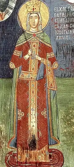 ![]() Княгиня Миліца, фреска з монастиря Любостиня, 1402—1405 рр. | |