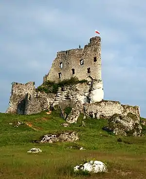 Історики припускають, що дерев'яно-земляні укріплення існували на місці замку і раніше. Спочатку оборонна споруда складалася лише з кам'яної сторожової вежі, яка підпорядковувалася сусідньому Боболицькому замку та разом з ним входила до оборонної системи Орлиних Гнізд. Вона належала шляхетській родині Лисів, яка також була власником сусіднього замку в Козєгловах. Вони першими ініціювали перетворення укріплень у лицарський замок. У 1378 році Людовик Угорський передав ці укріплення як лен Володиславу Опольському, однак через ворожу політику до Польщі Владислав Ягайло відібрав його у 1396 році[2].