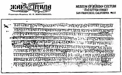 | 28-го сентября 1952 года в Русском Центре я прочел научный доклад под заглавием: Руськы писмены писано…- исторический обзор письменности, которая имелась у наших прадедов задолго до появления Византии на берегах Босфора. Теперь в моем распоряжении имеются самые древнейшие тексты русской летописи, написанные не летописцами-монахами, а язычниками-волхвами. И эти тексты подтверждают те прежние выводы, что у наших предков была своя письменность и своя азбука в первых веках после Рождества Христова… |