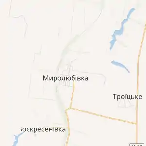 Селище Миролюбівка знаходиться на відстані 2,5 км від сіл Воскресенівка і Троїцьке. По селищу протікає пересихаючий струмок з загатою. Поруч проходить залізниця, станція Платформа 137 км за 1 км.