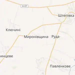 Село Миронівщина знаходиться на відстані 1 км від сіл Руда і Протопопівщина. По селу протікає пересихаючий струмок з загатою. Поруч проходять автомобільні дороги Т 1918 і Н07.
