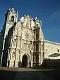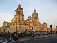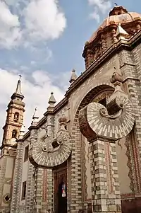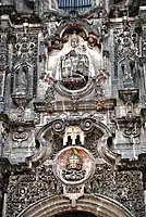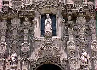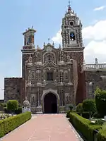 - Ацтекська архітектура мала велетенський, масивний вигляд. Головними будівельними матеріалами слугували вулканічний камінь «тесонтле» («кривавик»), цегла-сирець, деревина та вапняковий розчин. Мури споруд вкривали тиньком і фарбували в червоний чи білий колір. Дахи мали пласку форму з боків двориків і похилену форму назовні. Палаци мали також зубчасті архітектурні гребні. Тут знали колони, карнизи, декоративні фризи, різні сходинки з огорожами. Дерев'яних дверей, звичних для іспанців, тут не було, замість них використовували завіси. Архітектурних споруд ацтеків збережено досить мало. Всі вони були старанно поруйновані іспанцями-загарбниками, частково розібрані на будівельні матеріали і засипані шарами землі і сміття. На верхівках колишніх ацтекських пірамід були вибудовані католицькі собори, монастирі і церкви. В поруйнованому стані відкопані велична піраміда Чолули, Великий храм (в Мехіко), Тешкуцинго, Теопансолько, Тенаюка, Тепостеко в штаті Морелос, Каліштлауака, Маліналько, Уешотла біля Толуки тощо[6]. При створенні підземних ліній метро в Мехіко знайдено декілька підмурівок колишніх храмів та розбитих і монолітних скульптур, серед яких і камінь з зображенням богині місяця.