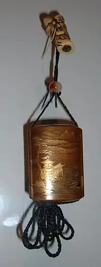 До досить екзотичних речей японського національного костюму належать інро — особливі скриньки для ліків чи ароматичних речовин. Типова їх форма — плаский циліндр, розділений на окремі ємності. Кожна ємність вставлялася в другу, а бічні сторони ємностей мають виступ з отвором для шнура, що поєднував все у єдину мініатюрну конструкцію. Шнур мав кульку-намистину та власне нецке. Пласка сторона інро слугувала для низьких рельєфів та розписів лаковими фарбами. Сюжети звичні ще за сюжетами гравюр — пейзажі, «квіти-птахи», побутові сцени, прогулянки, танцюристи, жінки з іграшковими човнами. Серед нетипових сюжетів інро Ермітажної збірки — зустріч самурая та його слуги з демоном у дощову пору, яка викликала розгубленість і тривогу (майстер Іідзука Тойо з князівства Ава).