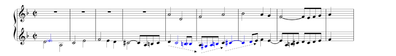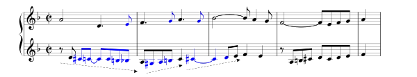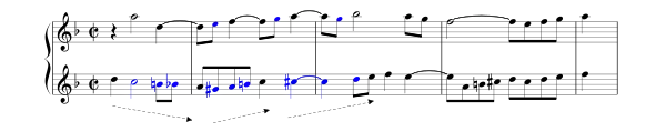 Пізніше з'являється нова тема (з елементами синкопи) — варіація старої, також в протискладенні з хроматичною темою