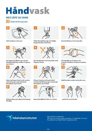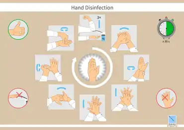 Всесвітня організація охорони здоров'я опублікувала плакат, де демонструється стандартне миття рук та протирання рук у секторах охорони здоров'я.[57] Проект інструкції з гігієни рук від цієї організацією можна знайти на її вебсайті, де він розміщений для публічного обговорення.[58]