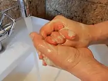 Правильна техніка миття рук, рекомендована Центром контролю захворювань США для запобігання передачі хвороби, включає наступні етапи:[43]
