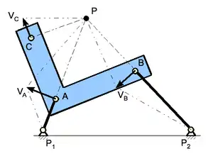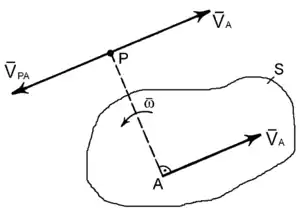 Якщо побудувати у точці А перпендикуляр до вектора швидкості , який напрямлений у бік отриманий поворотом вектора швидкості за напрямком обертання фігури і відкласти на цьому перпендикулярі відрізок довжиною , то обравши точку А за полюс, швидкість точки Р даної фігури буде визначатись за допомогою наступного векторного рівняння: