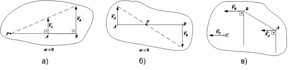 Якщо швидкості двох точок плоскої фігури напрямлені в різні боки і перпендикулярні до відрізка, що з'єднує ці точки, то миттєвий центр швидкостей лежить у точці перетину прямої, яка з'єднує кінці векторів швидкостей з наведеним вище відрізком (варіант б на рисунку).