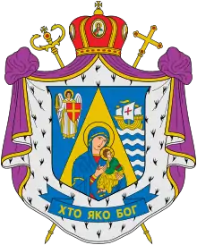 У центрі композиції щит, який розділений на три сегменти. В центральній частині щита у золотому вістрі Богородиця Неустанної Помочі в синьому мафорії та червонному хітоні тримає на руках Дитя у зеленій сорочці та золотому гіматії і сандалах; в обох — золоті німби. У правому синьому полі Архангел Михаїл із срібними крильми та золотим німбом, у срібному хітоні та золотому плащі, тримає у правиці золотий полум'яний меч, а в лівиці — червоний щит із золотим хрестом. У лівому синьому полі золотий корабель із срібними вітрилами та золотими прапорцями; під ним — п'ять срібних тонких хвилястих балок. Щит розміщений на пурпуровій мантії, підбитій горностаєм, увінчаній золотою єпископською митрою з червоним підкладом. Обабіч виходять золоті єпископський жезл і процесійний хрест. На синій стрічці девіз золотом: «ХТО ЯК БОГ».