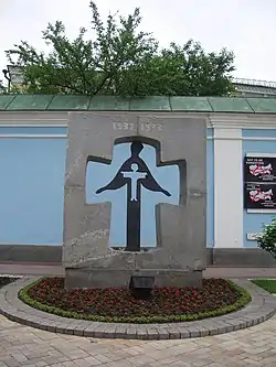 11 вересня 1993 року в рамках загальнонаціональних заходів щодо увіковічування пам'яті загиблих під час Великого Голоду було встановлено пам'ятний знак «жертвам Голодомору 1932—1933 років». Знак виконано у вигляді каменя з фігурою розіп'ятої жінки. Його відкриття освячував отець Сергій Ткачук за благословенням Патріарха Володимира[джерело?]. Від підніжжя знаку, розташованого біля входу до Михайлівського собору, від часу встановлення не зникають живі квіти[8].