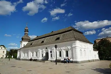 Колись на цьому місті стояла дерев'яна церква, вибудована в 1613 році. Перебудована в цеглі на початку XVIII ст. Має той же архітектурний прототип, що і будівля старого академічного корпусу з конгрегаційною церквою Благовіщення колишнього Братського монастиря. На відміну від неї (перебудованої у 1732—1740 рр. на триповерховий корпус архітектором Шеделем) залишилась одноповерховою. Вибудована у регіональних формах українського бароко. Фасади прикрашені пілястрами та віконними отворами, деякі закладені та стали нішами. Зі сходу до трапезної прибудована церква з банею, восьмерик на четверику, після реставрації — баня крита ґонтом.