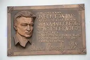 Одним з ініціаторів відбудови Михайлівського Золотоверхого монастиря був Олесь Гончар, меморіальну дошку якому відкрито 17 травня 2011 року на будівлі собору[15].