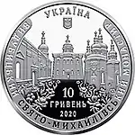 Собор в центрі срібної монети номіналом 10 грн. "Видубицький Свято-Михайлівський монастир"