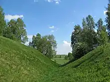 Квадратний замок (50х50 м) був оточений на сході, півдні та заході земляним валом (завширшки близько 15 м, заввишки 3,5-4 м) та оборонним ровом (завширшки 30 м, завглибшки до 15 м, крутизна схилів 45°), з півночі охороняється гравійним берегом річки. На земляному валі та на північному краю замку були дерев'яні стіни з 4 вежами по кутах.
