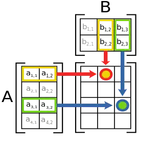 Ілюстрація праворуч демонструє обчислення добутку двох матриць A і B. Вона показує як перетини в добутку матриць відповідають рядкам матриці A і стовпцям матриці B. Розмір результуючої матриці завжди максимально можливий, тобто для кожного рядка матриці A і стовпця матриці B є завжди відповідний перетин в добутку матриць.