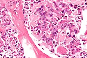 ![]() Знімок медулярного раку щитоподібної залози – однієї з складових МЕН2Б. Фарбування Г-Е. Знімок медулярного раку щитоподібної залози – однієї з складових МЕН2Б. Фарбування Г-Е. | |