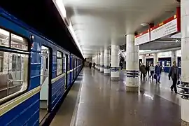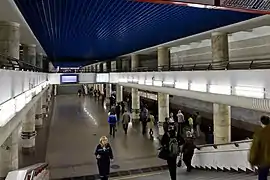 Інтер'єри платформи, вестибюлів, пішохідних переходів виконані з поділом простору на функціональні зони: зони транзиту, посадки і очікування. Єдиний простір двох'ярусної платформної частини і вестибюлів з бічними пішохідними галереями по горизонталі об'єднується темою темно-синьої підвісної стелі в центральному прольоті станції, а по вертикалі розділяється на два яруси круглими колонами зі світлого мармуру.