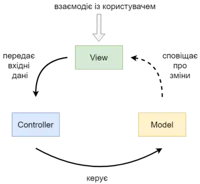 Цей шаблон передбачає поділ системи на три взаємопов'язані частини: модель даних, вигляд (інтерфейс користувача) та модуль керування. Застосовується для відокремлення даних (моделі) від інтерфейсу користувача (вигляду) так, щоб зміни інтерфейсу користувача мінімально впливали на роботу з даними, а зміни в моделі даних могли здійснюватися без змін інтерфейсу користувача.