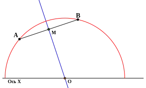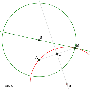 Будуємо відрізок, що з'єднує дві точки. Будуємо перпендикуляр, що проходить через середину відрізка. Знаходимо перетин цього перпендикуляра з віссю . Будуємо коло з центром у точці перетину, що проходить через дані точки (тільки верхню частину вище від ).