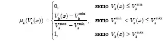 Розглянемо загальні принципи вибору портфеля інвестицій з використанням теорії нечітких рішень. Позначимо через X множину n об'єктів інвестування, де ximin та ximax дорівнюватиме величині мінімально та максимально можливих вкладень в і-й об'єкт. Припустимо, що на ринку може виникнути m різних ситуацій, сценаріїв розвитку подій. Прибуток від інвестування в і-й об'єкт за умови розвитку k-го сценарію на ринку позначимо через Vik. Тоді дохід усього інвестиційного портфеля в k-ій ринковій ситуації дорівнюватиме Vk(x)=. Для кожного сценарію інвестор визначає діапазон очікуваного доходу за деякий інвестиційний період, що знаходитиметься в межах від Vkmin до Vkmax. Рівень ефективності вкладення інвестицій в портфель х можна визначити за допомогою лінійної функції належності, що належить до проміжку [0, 1] і визначається формулою