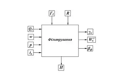 Вхідними факторами процесу фільтрування є (рис. ): характеристики вихідної сировини, зокрема, гранулометричний склад вихідного матеріалу (Г1), об’ємне навантаження на операцію (Q1), вакуум і тиск повітря (w, p).