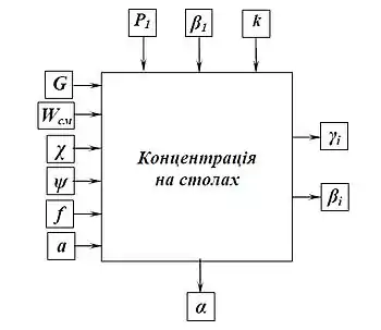 Вихідні фактори: вихід продуктів (γi) і вміст в них корисного компоненту (βi). Основними оперативними керуючими факторами процесу концентрації на столах є навантаження по вихідному матеріалу (G1), витрата змивної води (Wзм), кут нахилу деки у подовжньому і поперечному напрямках (χ, ψ). Проміжним фактором можна розглядати вміст твердого в живленні (α).