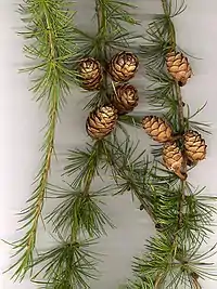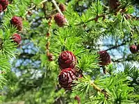 Модрина європейська: листя і шишки.
