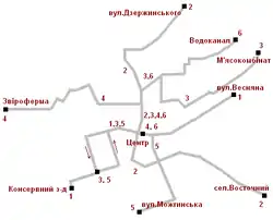 Через невелику площу території міста кількість маршрутів всього 6, але вони охоплюють майже всю територію міста: