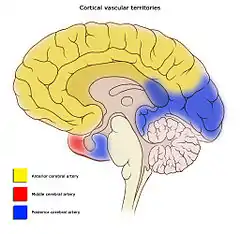 | Кровопостачання ділянок головного мозку різними артеріями. Кровопостачання розділено на передній сегмент (внутрішні сонні артерії та їхні гілки) та задній сегмент (хребетні артерії) | |