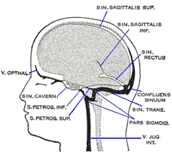 | Схема вен і венозних синусів, які виводять деоксигеновану (зі зменшеною концентрацією кисню) венозну кров з мозку (Анатомія Грея) | |