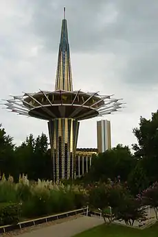 На зовнішній вигляд вежі вплинула вежа «Космічна голка» в Сіетлі, а палітра з білого, золотистого і чорного кольору створили образ розкоші. На вершині вежі горить вічний вогонь, який символізує хрещення Святим Духом .