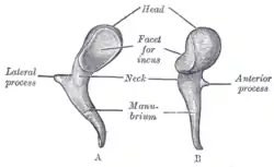 ![]() Будова лівого молоточка на малюнку з Анатомії Грея: голівка (head), місце зіткнення з коваделком (facet for incus), шийка (neck), руків'я (manubrium) | |