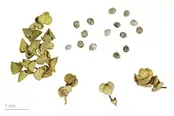 Плід — тригорішок завдовжки 3—5 мм та завширшки 4,5—6 мм, притиснуто-кулястий, з трьома глибокими борозенками та опуклими дрібногорбкуватими лопатями. Насінини 2,8—3 мм завдовжки, 2,2—2,5 мм завширшки, кулясто-яйцеподібні, гладенькі, білі з кількома темними цятками, з ниркоподібним придатком.