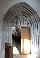 У 1370 році будівництво церкви завершилося. Це був готичний храм, що складався з основної 12-гранної будівлі, увінчаної дуже гострим пірамідальним дахом, та дзвіниці, що стояла поруч. Дотепер зберігся готичний портал з основоположним тимпаном. На ньому зображена група Розп'яття, біля якої на колінах стоять фігури Людвіга Баварського і його дружини Маргарити Нідерландської.