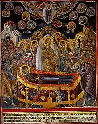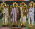 На куполі Всемогутній, оточений ангелами та Богоматір'ю. На зводі фігури пророків, а у кутках — четверо євангелістів. Під зводом храму — Платитера серед янголів. Зображено також ієрархів, Успіння, П'ятидесятниця та Небесна Літургія. На західній стороні у кутках храму займають своє місце Благовіщення та пророк Ісая поруч із Богородицею та цар Давид поруч із Архангелом Гавриїлом.
