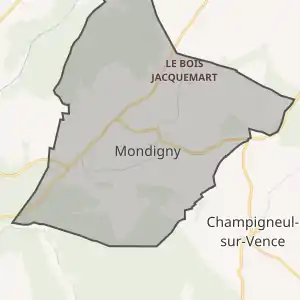 - Розташування муніципалітету Мондіньї на мапі Франції та сусідні муніципалітети