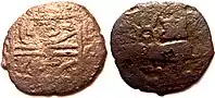 - 2) Данг. 1339 (739 р.Г.). У крапковому колі подвійний чотирикутник з віньєтками в сегментах. В полі легенда в 3 рядки: «Султан / Мухаммад / Узбек хан». На реверсі вихідні позначено місце карбування та рік.