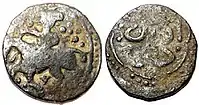 - 1) На аверсі в чотирикутнику позначення місця карбування. Ліворуч та праворуч від чотирикутника малі трикутники, у центрі Т-подібна тамга зубцями вгору. На реверсі в крапковому колі зображення міфологічного звіра, прямуючого праворуч[53].