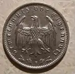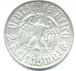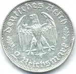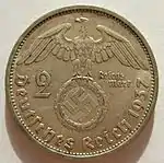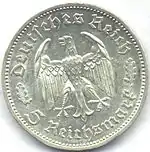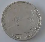 Після смерті президента Гіндербурга в пам'ять про генерал-фельдмаршала в обіг надійшли срібні монети номіналом 2 та 5 марок. За своєю сутністю вони уявляли собою пам'ятні монети, однак у зв'язку з відсутністю нових подібних монет, їх продовжували карбувати до самого початку Другої світової війни. В 1940 році були створені пробні монети з зображенням Гітлера. Однак їх випуск був відкладений до перемоги у війні[40], і в обіг вони так і не надійшли.