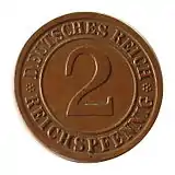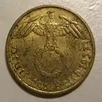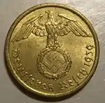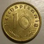 10 пфеннигів | 21 | 4 | 90 насічок | 0,915 Cu, 0,085 Al | 1936—1939 | Загалом[20] — 280 758 191[21] | Саар — 15.01.1948 ФРН — 1.09.1949 Західний Берлін — 20.03.1949 НДР — 03.04.1949 Австрія — 01.02.1949 |