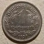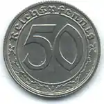 50 пфеннигів | 22,5 | 1,333 | 72 насічки | Al | 1935 | Загалом[22] — 140 057 594[13] | Саар — 15.01.1948 ФРН — 1.09.1949 Західний Берлін — 14.10.1948 НДР — 01.11.1948 Австрія — 24.12.1947 | |