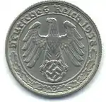 50 пфеннигів | 20 | 3,5 | 126 насічок | Ni | 1933, 1935—1938 | Загалом[8] — 46 469 708 | 01.08.1940 | |