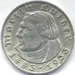 У Третьому рейху кількість монетних типів, присвяченних тій чи іншій події, на відміну від Веймарської республіки, було вкрай невеликим. Їх випуск здійснювався лише в перші роки правління Гітлера. 26 серпня 1941 року у зв'язку з активними військовими діями міністерство фінансів забов'язало державні фінансові установи та банки вилучити з обігу відкарбовані раніше монети зі срібла, в тому числі і пам'ятні[26]. Першими пам'ятними монетами стали 2 та 5 марок, присвячені 450-річчю від дня народження ініціатора Реформації Мартіна Лютера. Їх особливістю стало використання в написі шрифта фрактури замість антикви. При цьому літери на гурті були виконані звичною для граверів антіквою[26]. Сам же гуртовий напис уявляв собою перший рядок євангельського гімну «Господь наш меч», написаного Лютером в 1529 році.
