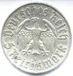 5 марок | 29 мм | 13,889/12,5 | EIN FESTE BURG IST UNSER GOTT (укр. Господь наш меч) | 0,900 Ag, 0,100 Cu | 1933 | Загалом[29] — 200 000[26] | 26.08.1941 |