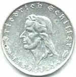 Найбільш рідкісними монетами Третього рейху є відкарбовані на честь 175-річчя німецького поета Фрідріха Шиллера 2 та 5 марок. На відміну від інших монет, що випускалися на всіх монетних дворах країни, тираж цих монет відбувся в столиці історичної області Німеччини Вюртемберга Штутгарті[38]. Саме в цій області виріс та провів більшу частину свого життя Фрідріх Шиллер. Монета містить зображення поета, напів-кругові написи «Friedrich Schiller» та «1759 — 1934» на аверсі. На гурті розташована цитата з найбільш відомого твору Шиллера «Вільгельм Телль» «ANS VATERLAND ANS TEURE SCHLIEß DICH AN»[38], що дослівно означає «Прильни до дорогої вітчизни». Увесь вираз в літературному перекладі звучить як:
